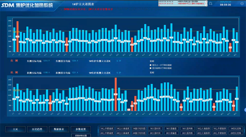 在煉焦環(huán)節(jié),焦爐自動測溫和優(yōu)化加熱系統(tǒng)成為節(jié)能降耗的“利器”。276個立火道紅外測溫點實時采集溫度數據,結合荒煤氣溫度與煙氣殘氧分析,系統(tǒng)自動調節(jié)煤氣流量與分煙道吸力,預計使加熱煤氣消耗降低2.8%,全爐溫度均勻系數提升至0.92。通過火落時間預測與標準溫度動態(tài)優(yōu)化,顯著減小結焦時間偏差,大幅減少了能源浪費。